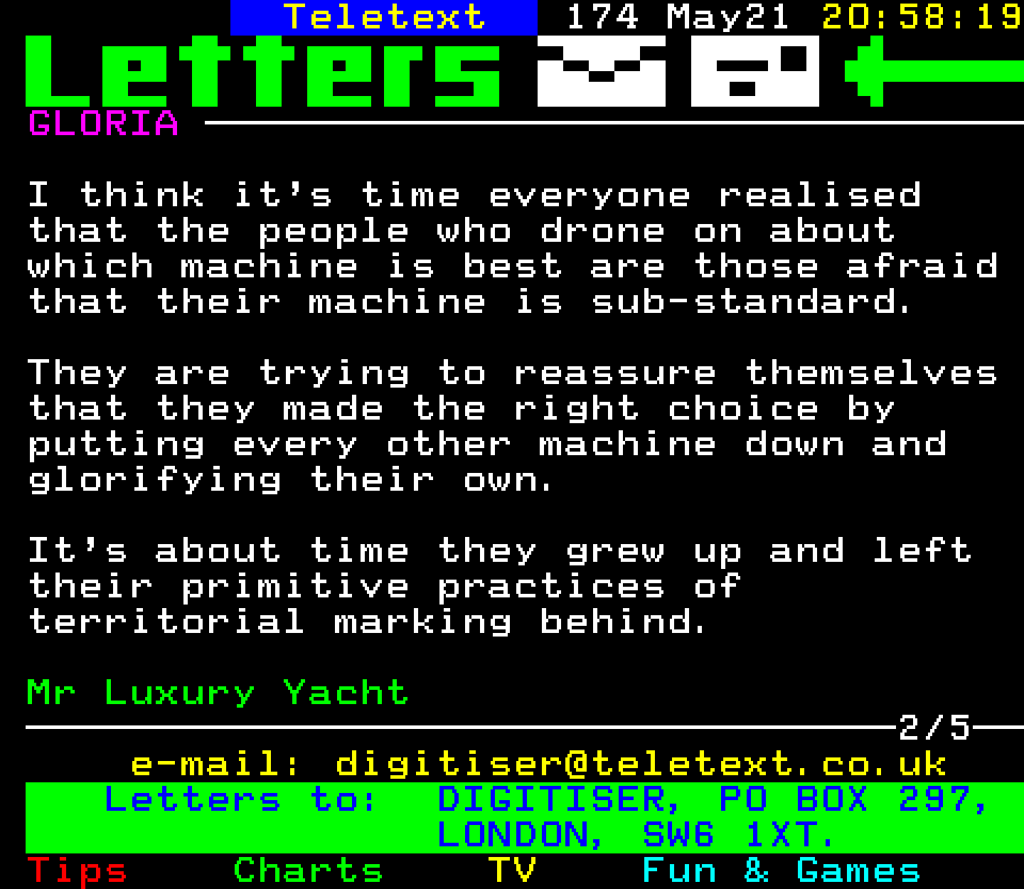 Do you have any full screenshot images of Digitiser that you'd like to see included in this archive? I'd just love to include them here - please email (superpage58@gmail.com) and the Digi community will be eternally grateful. Hey: even photos of your old TV showing the teletext page are good to be included!