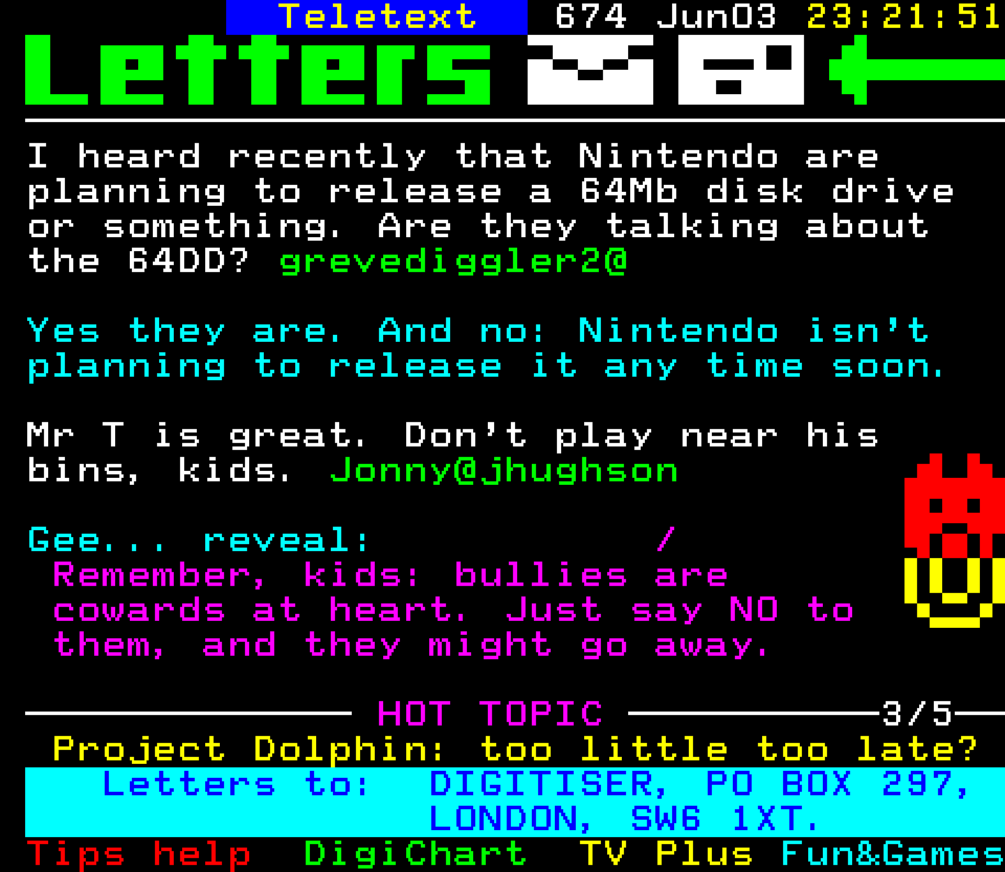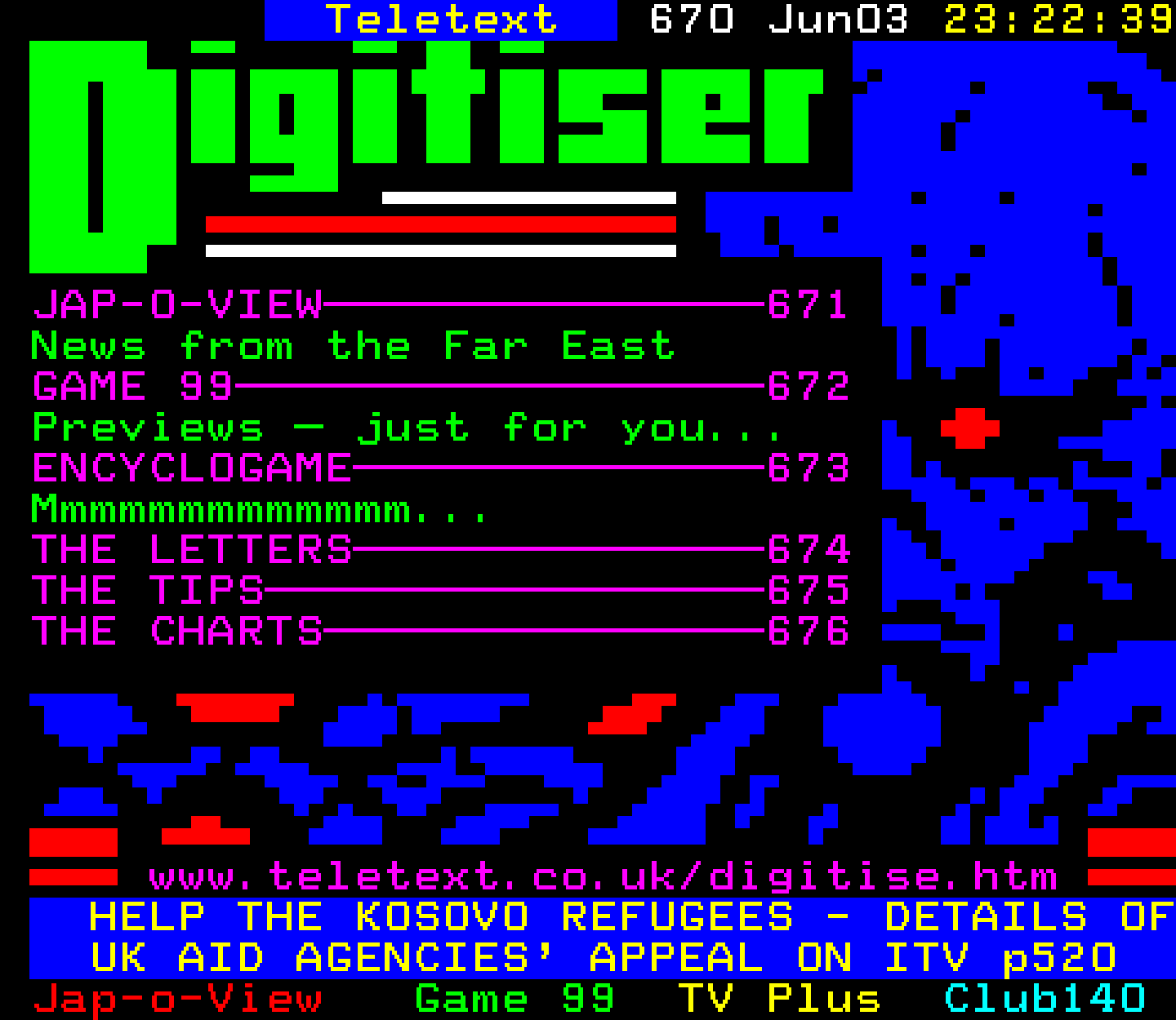 Do you have any full screenshot images of Digitiser that you'd like to see included in this archive? I'd just love to include them here - please email (superpage58@gmail.com) and the Digi community will be eternally grateful. Hey: even photos of your old TV showing the teletext page are good to be included!