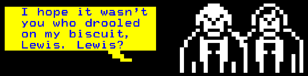 LEWIS: Ppppppfpfpfft! Rhuhphpuphphph! Blaa-blaaa-blaaaaaaaaart-thrrrrrp! Gwngnthrunmp.