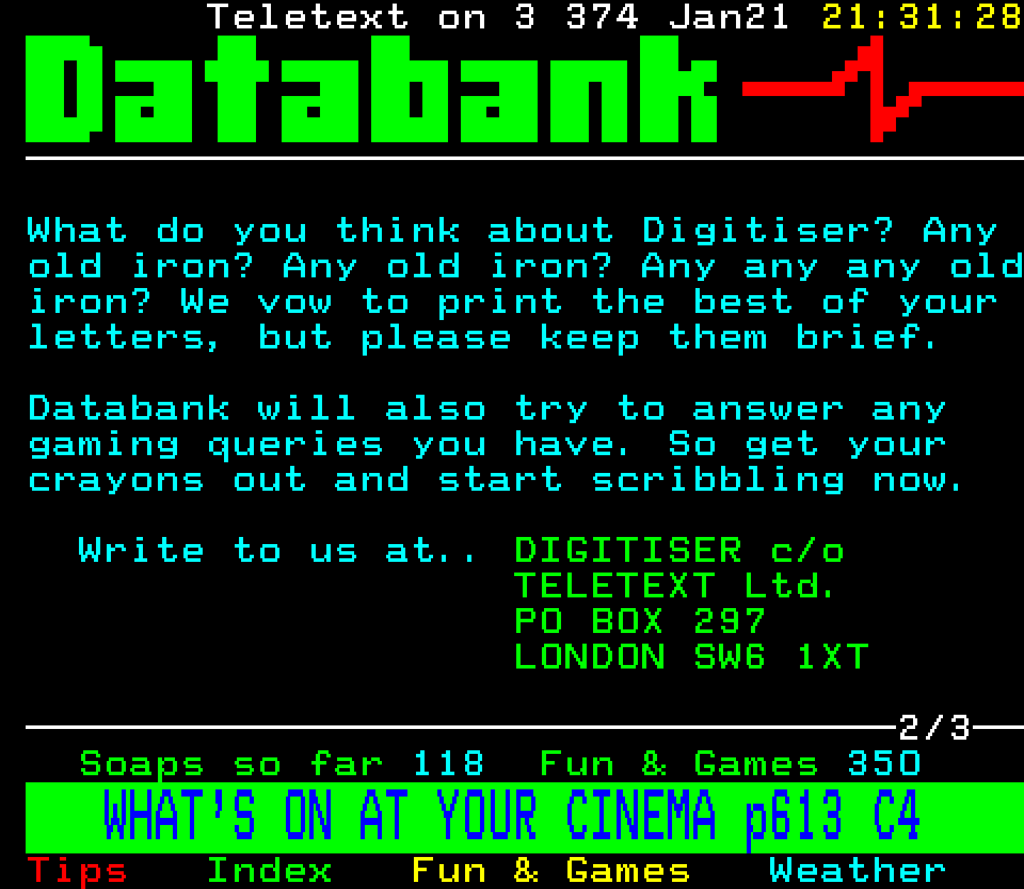 Do you have any full screenshot images of Digitiser that you'd like to see included in this archive? I'd just love to include them here - please email (superpage58@gmail.com) and the Digi community will be eternally grateful. Hey: even photos of your old TV showing the teletext page are good to be included!