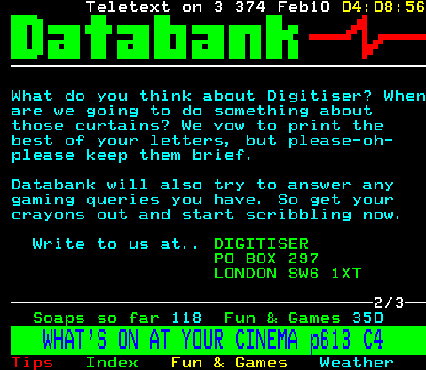 Do you have any full screenshot images of Digitiser that you'd like to see included in this archive? I'd just love to include them here - please email (superpage58@gmail.com) and the Digi community will be eternally grateful. Hey: even photos of your old TV showing the teletext page are good to be included!