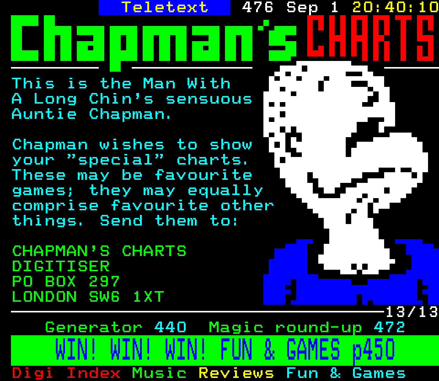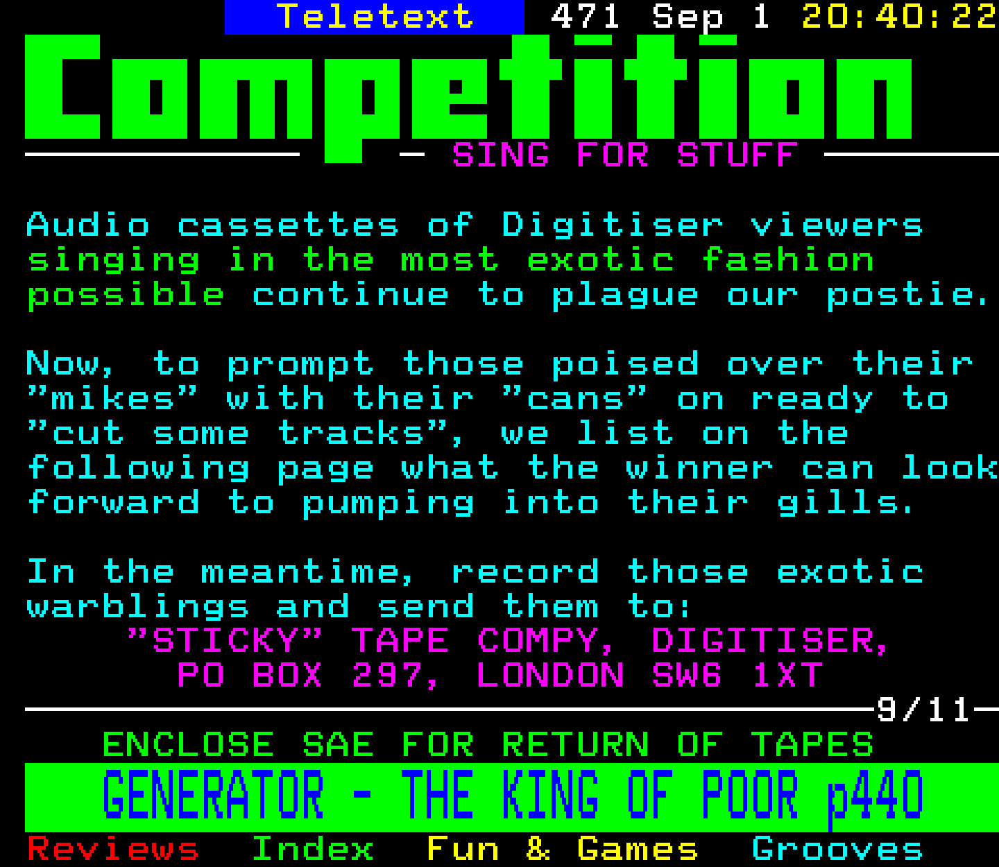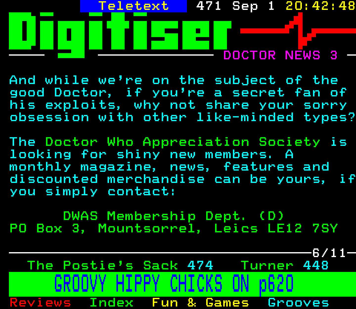 Do you have any full screenshot images of Digitiser that you'd like to see included in this archive? I'd just love to include them here - please email (superpage58@gmail.com) and the Digi community will be eternally grateful. Hey: even photos of your old TV showing the teletext page are good to be included!
