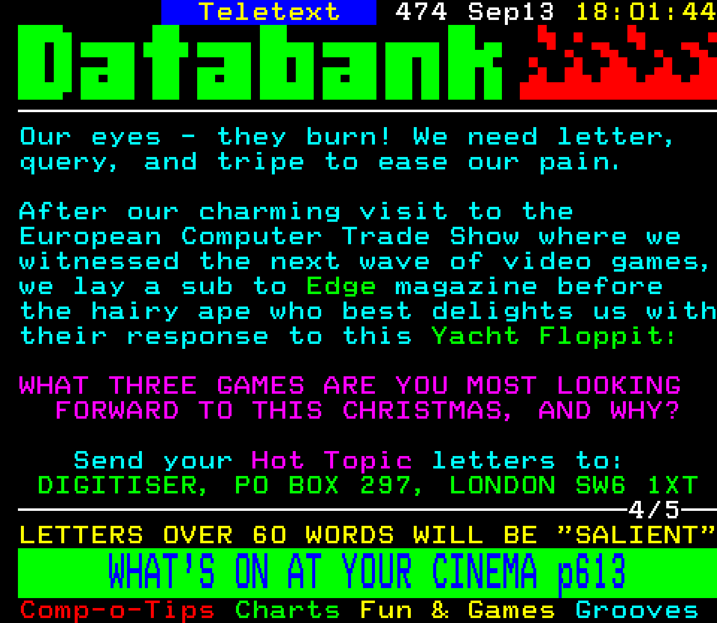 Do you have any full screenshot images of Digitiser that you'd like to see included in this archive? I'd just love to include them here - please email (superpage58@gmail.com) and the Digi community will be eternally grateful. Hey: even photos of your old TV showing the teletext page are good to be included!