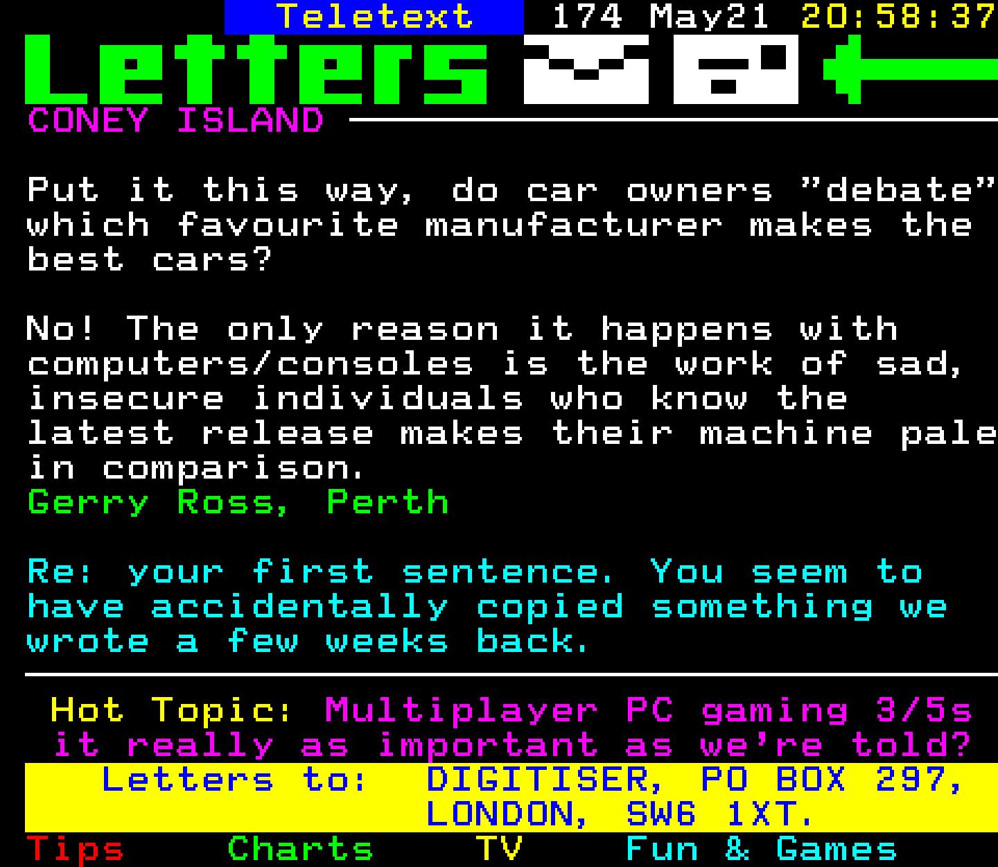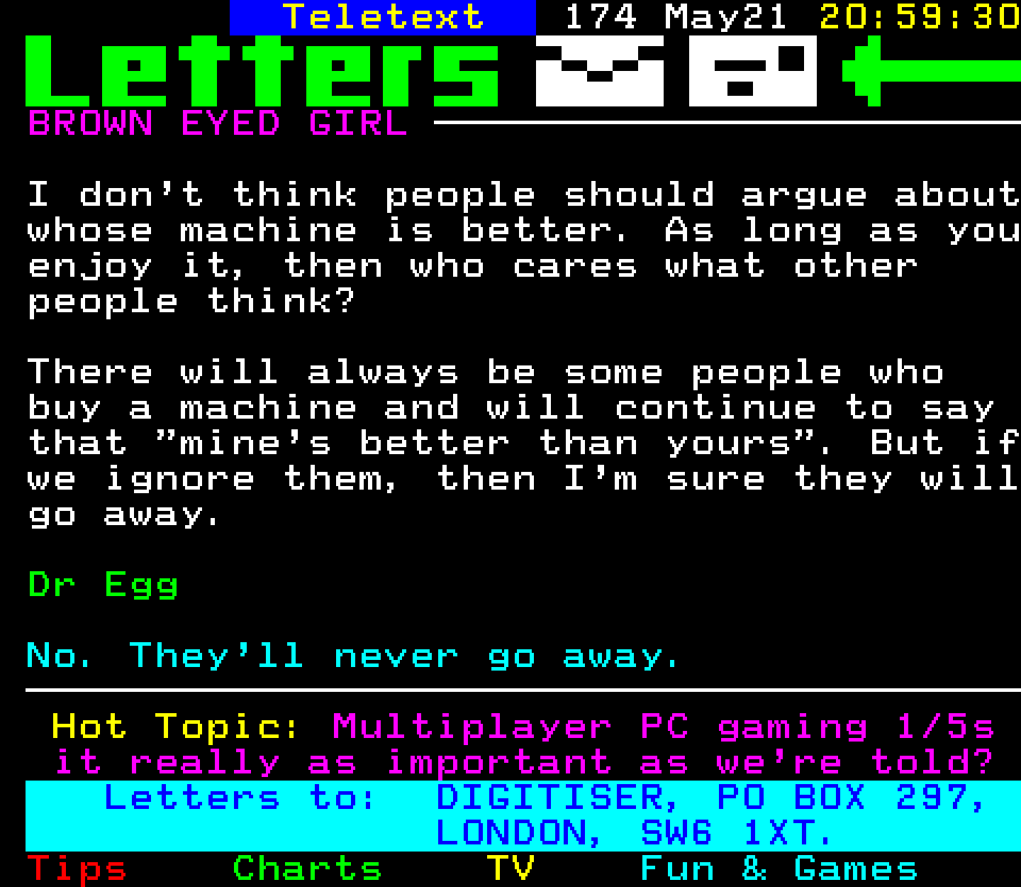 Do you have any full screenshot images of Digitiser that you'd like to see included in this archive? I'd just love to include them here - please email (superpage58@gmail.com) and the Digi community will be eternally grateful. Hey: even photos of your old TV showing the teletext page are good to be included!