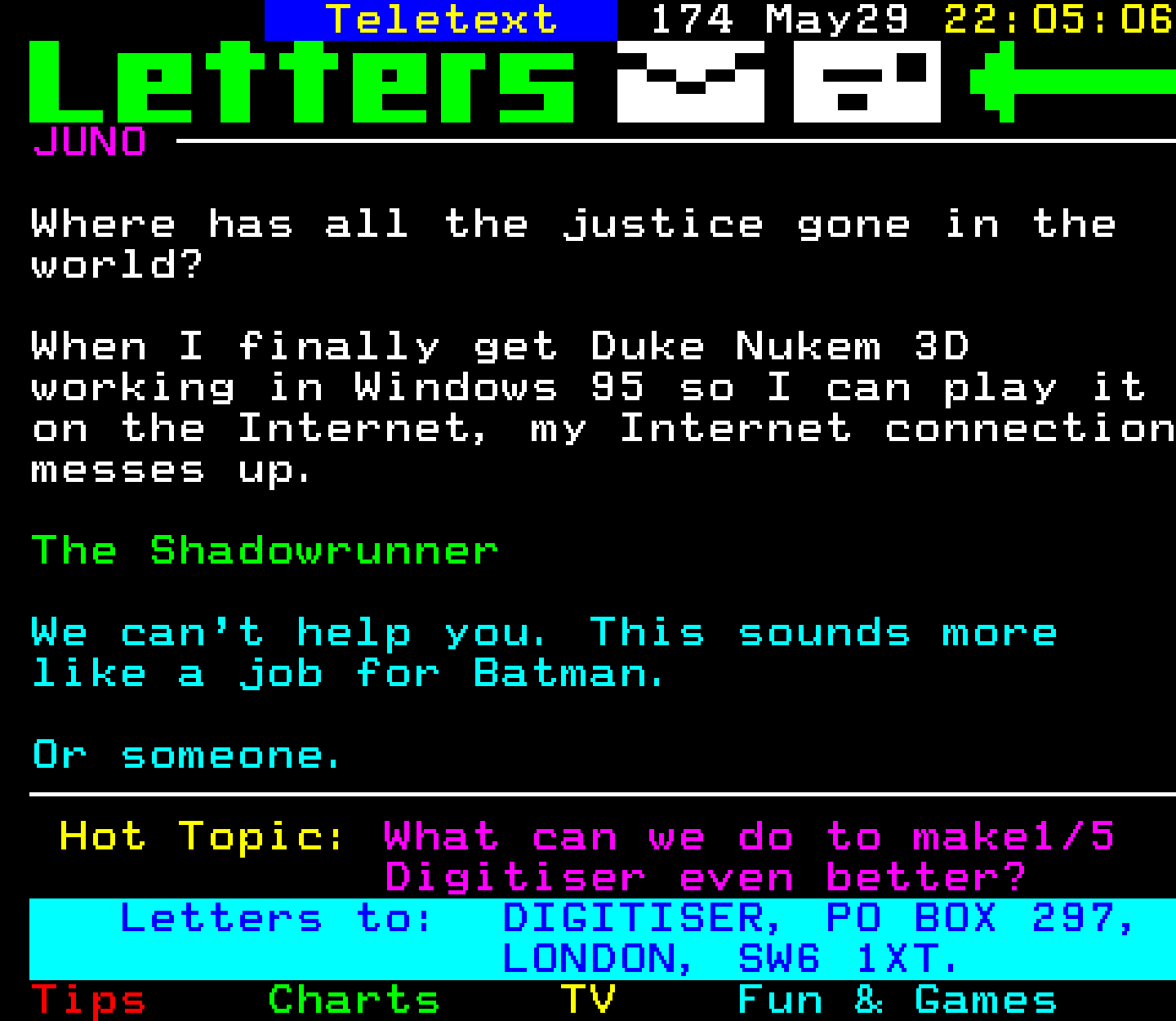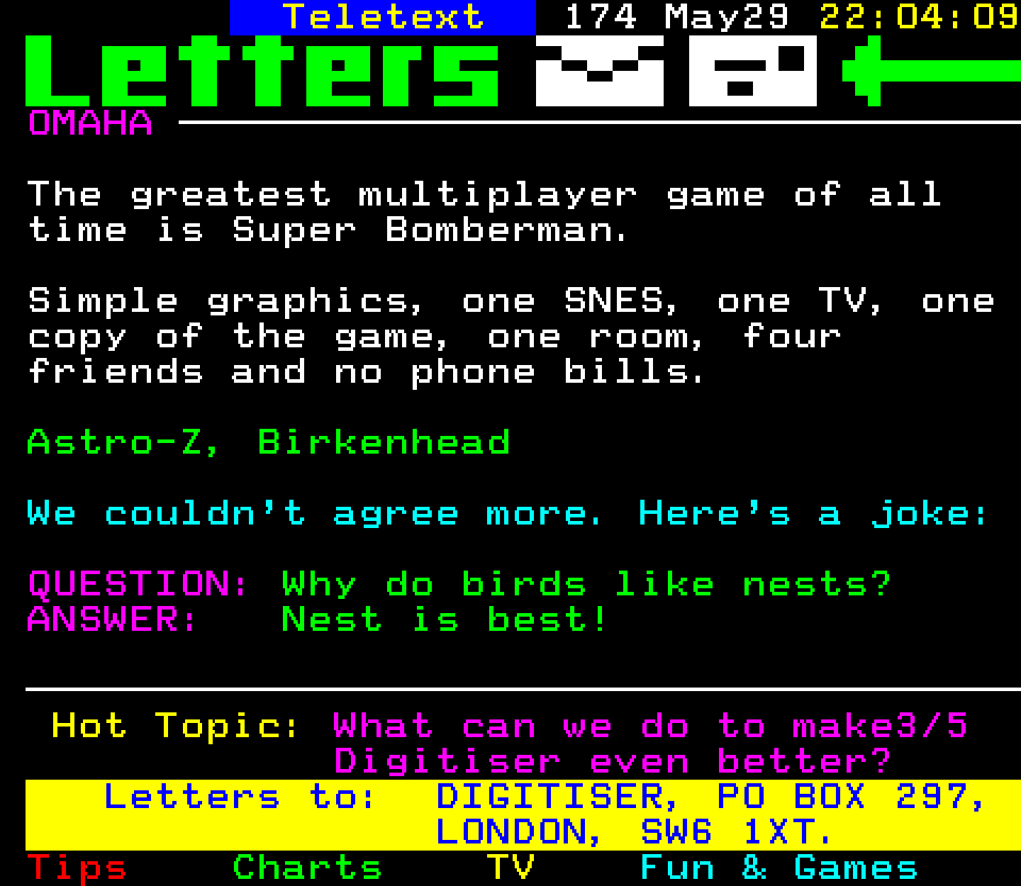 Do you have any full screenshot images of Digitiser that you'd like to see included in this archive? I'd just love to include them here - please email (superpage58@gmail.com) and the Digi community will be eternally grateful. Hey: even photos of your old TV showing the teletext page are good to be included!