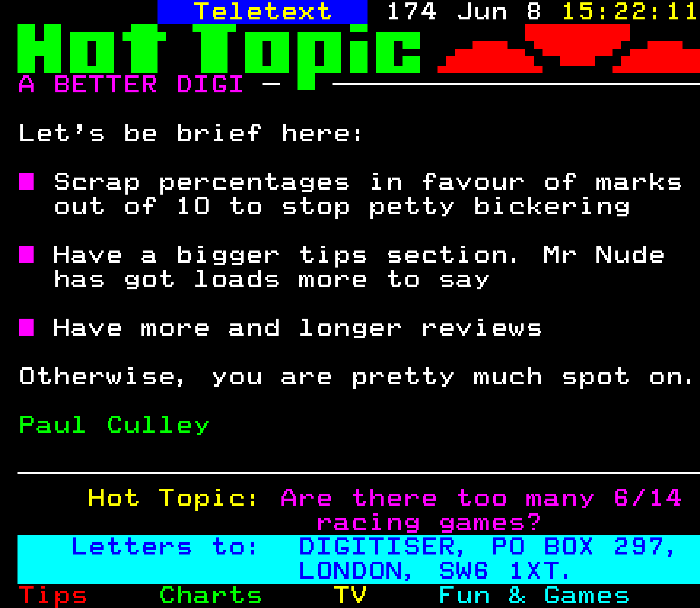 Do you have any full screenshot images of Digitiser that you'd like to see included in this archive? I'd just love to include them here - please email (superpage58@gmail.com) and the Digi community will be eternally grateful. Hey: even photos of your old TV showing the teletext page are good to be included!