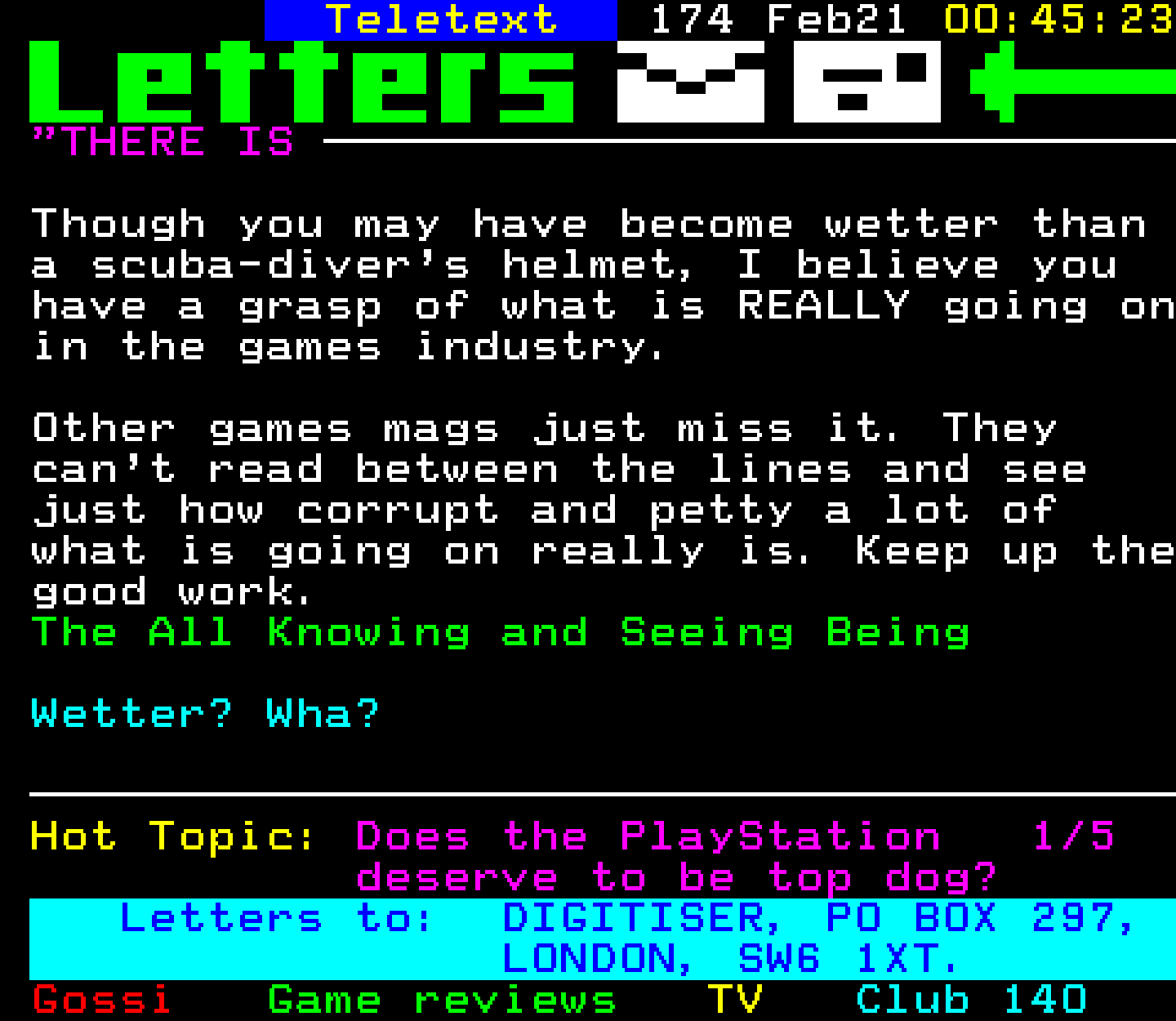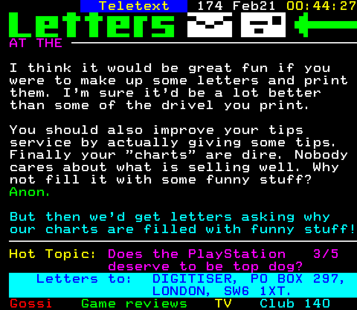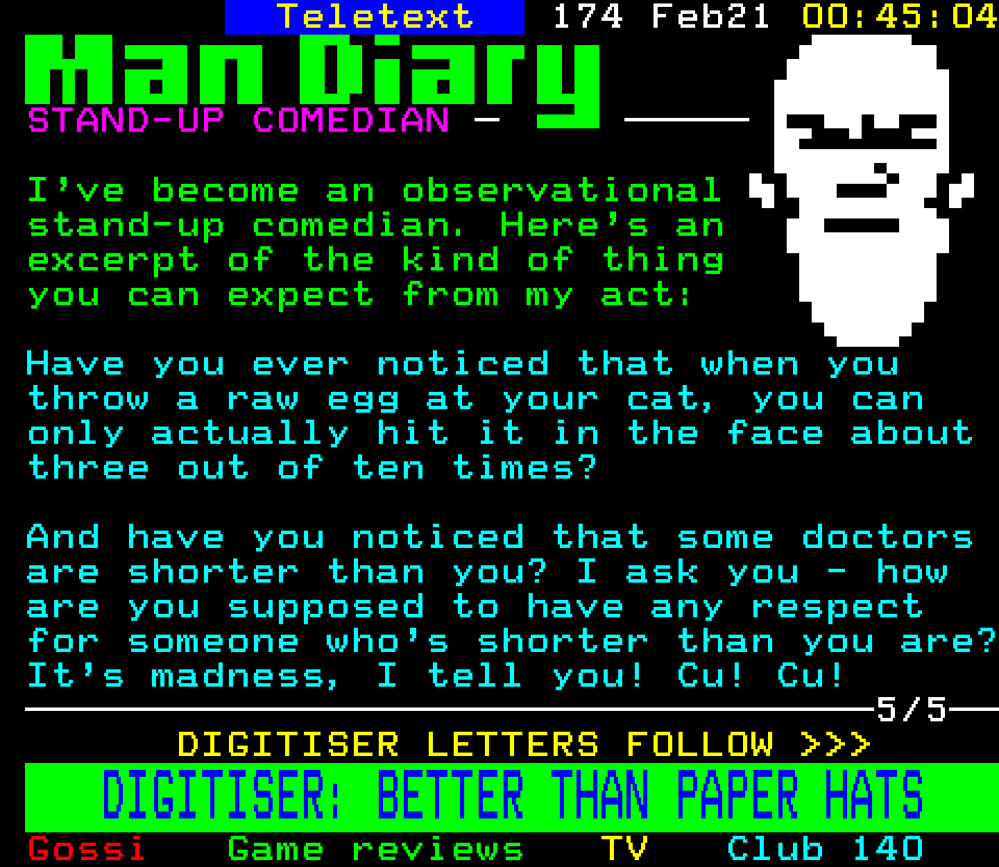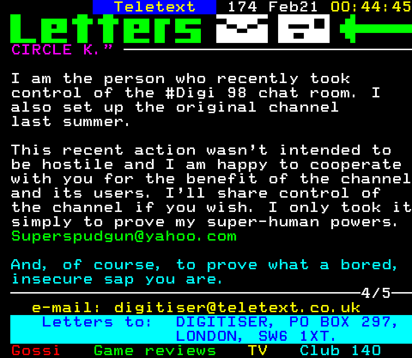 Do you have any full screenshot images of Digitiser that you'd like to see included in this archive? I'd just love to include them here - please email (superpage58@gmail.com) and the Digi community will be eternally grateful. Hey: even photos of your old TV showing the teletext page are good to be included!
