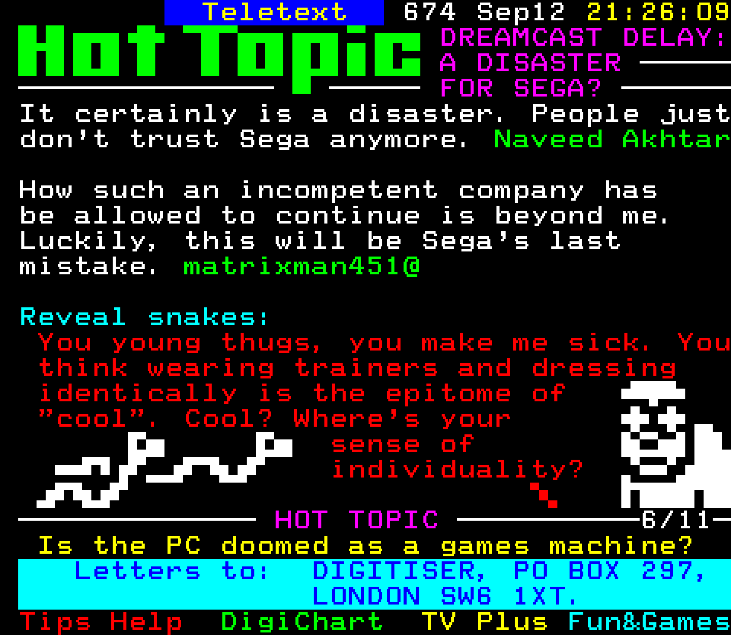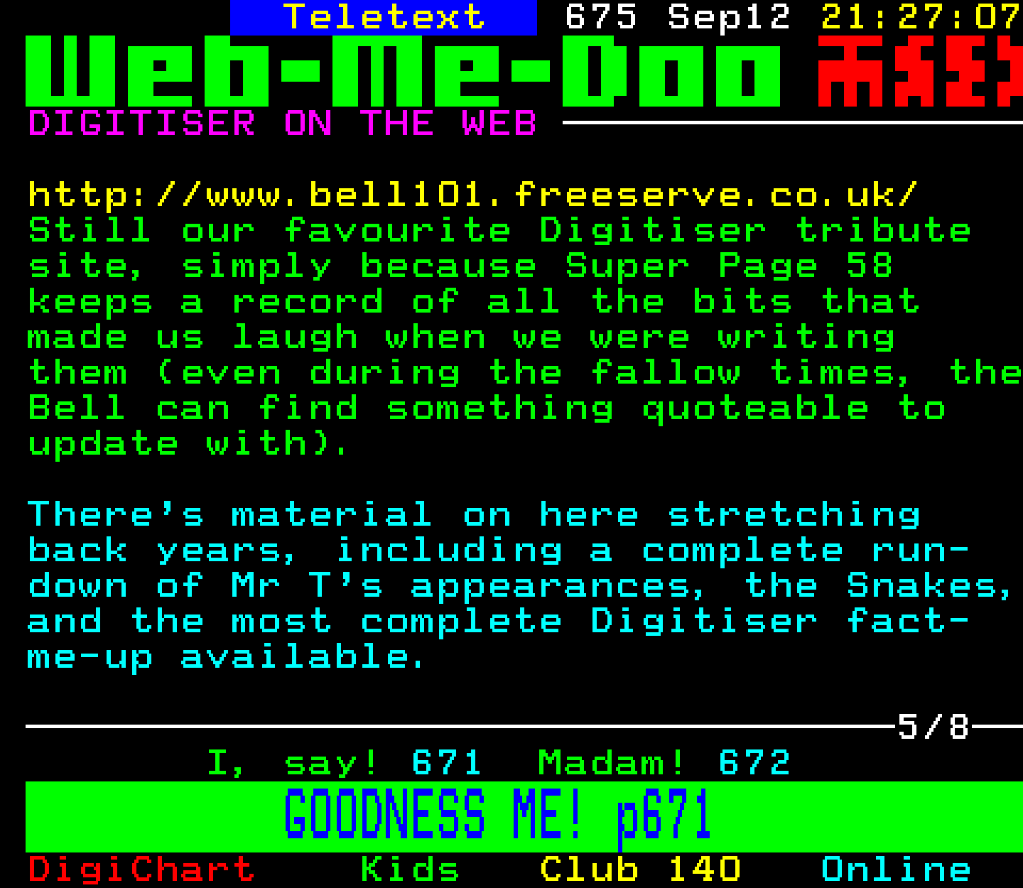 Do you have any full screenshot images of Digitiser that you'd like to see included in this archive? I'd just love to include them here - please email (superpage58@gmail.com) and the Digi community will be eternally grateful. Hey: even photos of your old TV showing the teletext page are good to be included!
