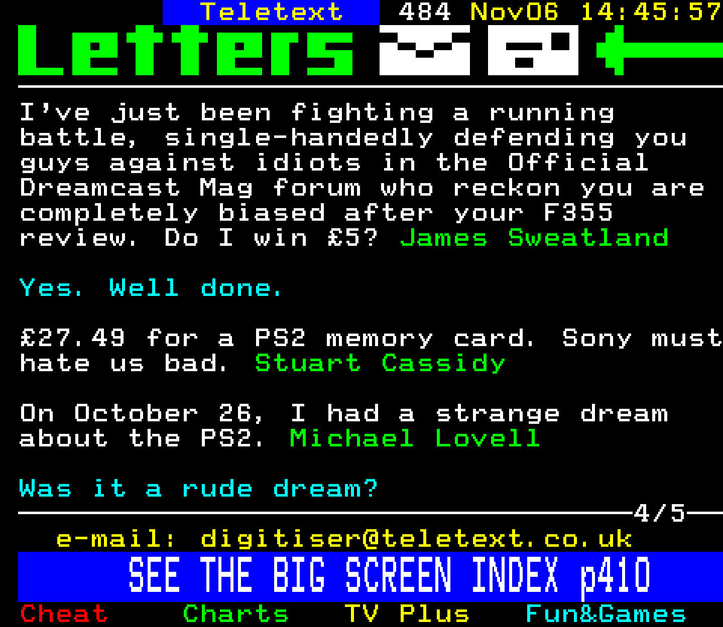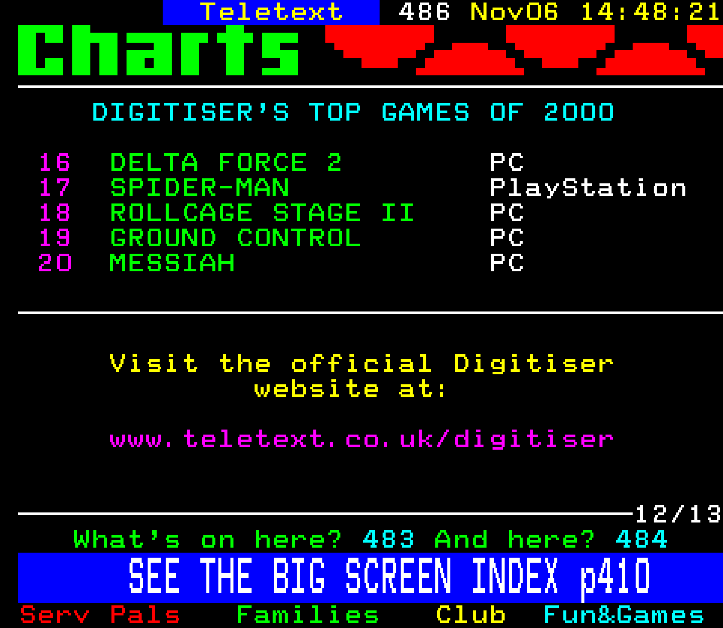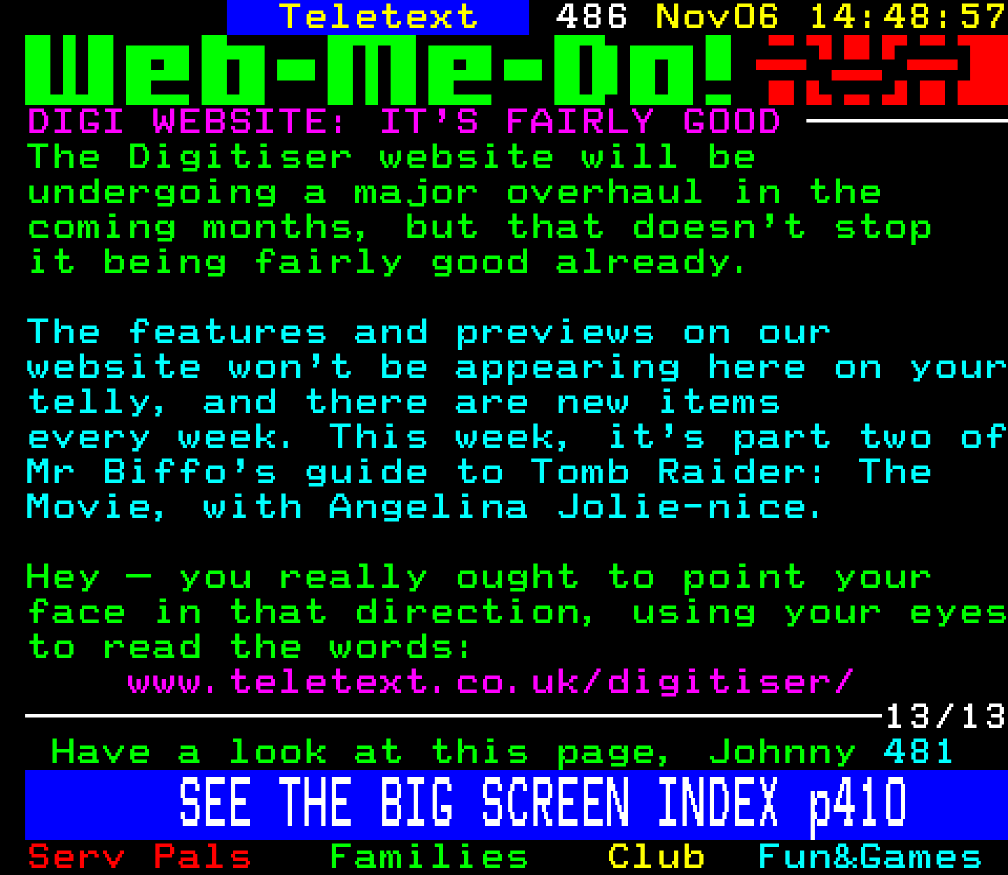 Do you have any full screenshot images of Digitiser that you'd like to see included in this archive? I'd just love to include them here - please email (superpage58@gmail.com) and the Digi community will be eternally grateful. Hey: even photos of your old TV showing the teletext page are good to be included!