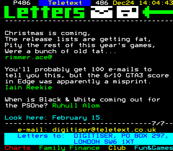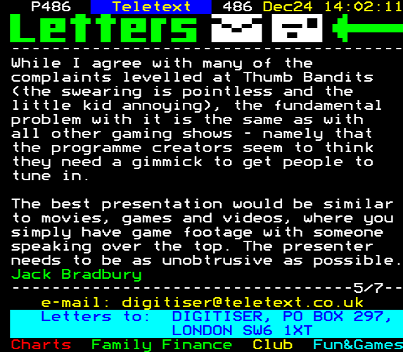Do you have any full screenshot images of Digitiser that you'd like to see included in this archive? I'd just love to include them here - please email (superpage58@gmail.com) and the Digi community will be eternally grateful. Hey: even photos of your old TV showing the teletext page are good to be included!